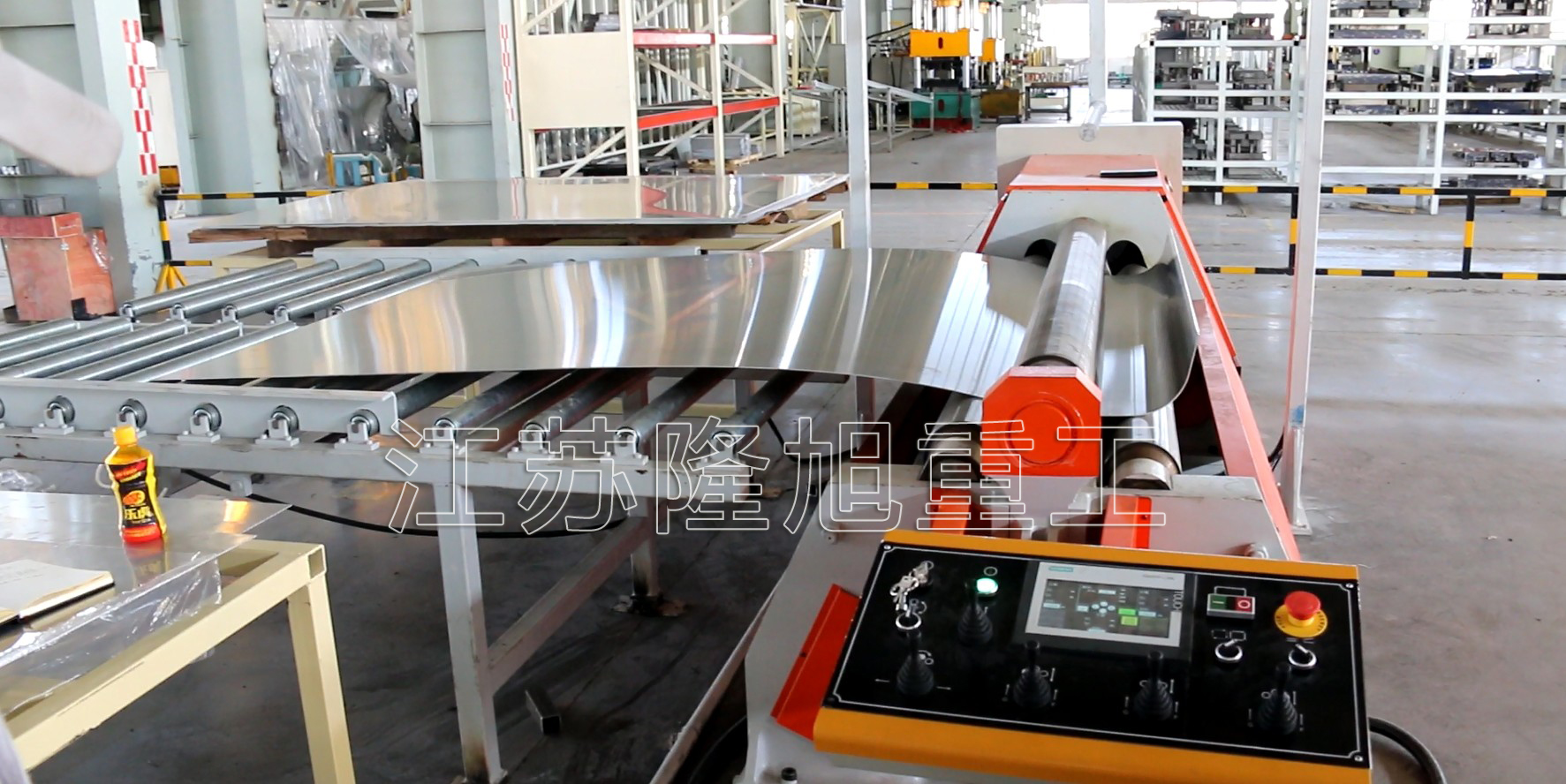 該生產(chǎn)線用于卷制容量800升的汽車(chē)油箱,其包括: 一臺(tái)全自動(dòng)數(shù)控四輥卷板機(jī),自動(dòng)托料系統(tǒng),電動(dòng)送料軌道,氣動(dòng)板料對(duì)正裝置,自動(dòng)退料裝置。整個(gè)卷板過(guò)程從對(duì)料、進(jìn)料、卷制、托料、退料實(shí)現(xiàn)全自動(dòng)一體化。全程無(wú)人操作,有效降低企業(yè)人工成本,提高生產(chǎn)效率。